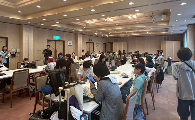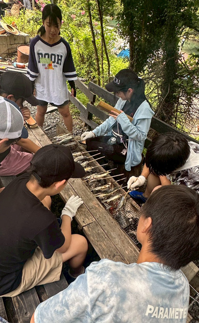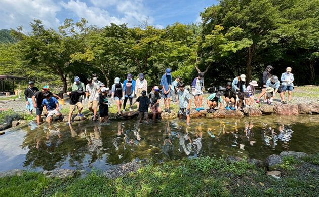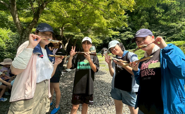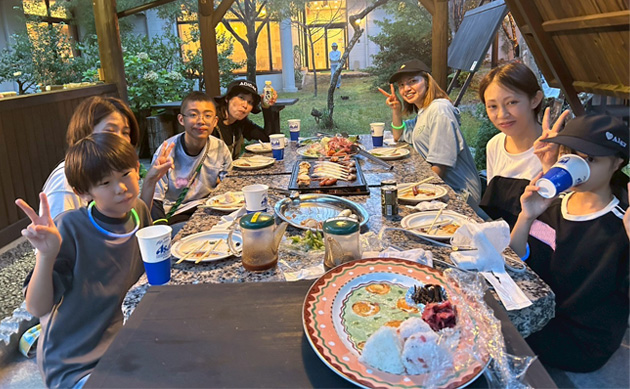 子ども22名・14世帯 総参加43名で奥伊勢に行ってきました。曇り空の中、1日目は、屋内外でのレクレーションを楽しみ夕食はBBQ、夜はバスに乗りナイトウォッチング(夜景・森の動物)を楽しみました。2日目は、魚つかみ捕り体験を楽しみ捕った魚をその場で自分たちで焼き美味しくいただきました。また、保護者会も取り入れ語り合いました。子ども同士、子どもとOB・OG、保護者同士交流を深め合い新たな絆も生まれ、子ども達は2日間笑顔で過ごしました。